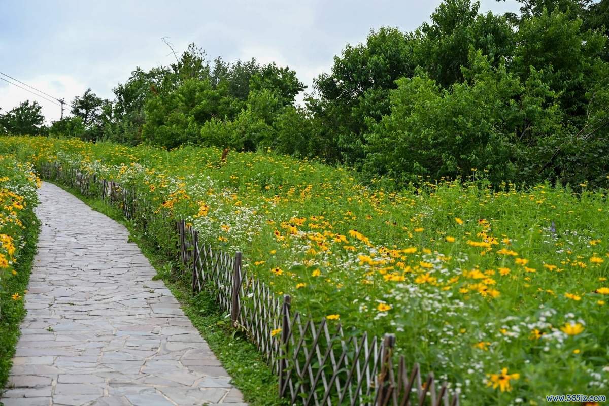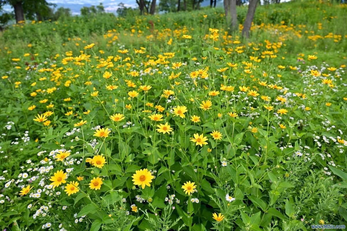 棉花般的云朵让太空似漫画梦境,漫天遍野的小黄花,如点点繁星逶迤至山顶。